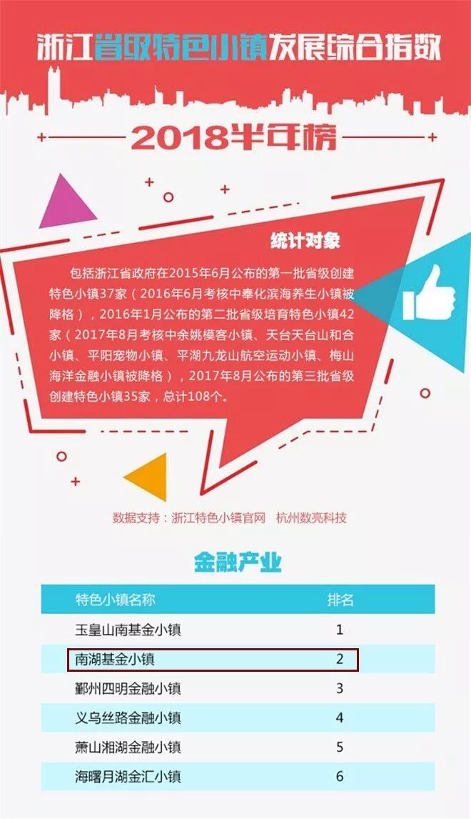 近日,浙江省级特色小镇发展综合指数2018半年排行榜正式出炉。榜单根据浙江“十三五”重点发展的信息、环保、健康、旅游、时尚、金融、高端装备制造业等7大万亿级产业及茶叶、丝绸等历史经典产业进行分类排行。南湖基金小镇暂居2018浙江省级特色小镇发展综合指数半年榜——金融产业小镇排名第二,未来也将以更高的要求,打造高质量产业集聚区。