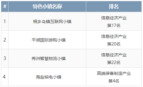 此外,嘉善巧克力甜蜜小镇、桐乡毛衫时尚小镇、海宁皮革时尚小镇都在所属领域排名前三,在发展地方特色、推动区域经济上发挥了显著的作用。